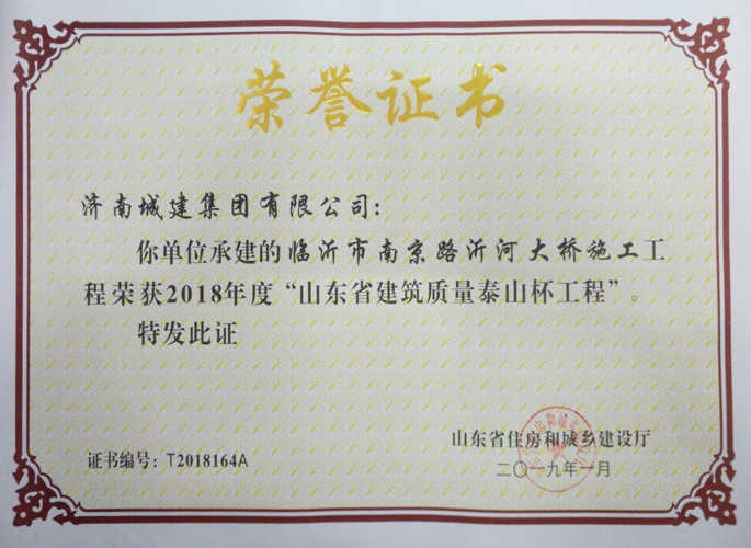 臨沂市南京路沂河大橋施工工程被評(píng)為2018年度“山東省建筑質(zhì)量泰山杯工程”