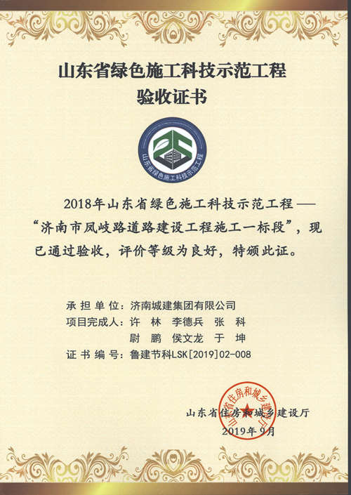 濟(jì)南市鳳歧路道路建設(shè)工程施工一標(biāo)段被評為2018年山東省綠色施工科技示范工程