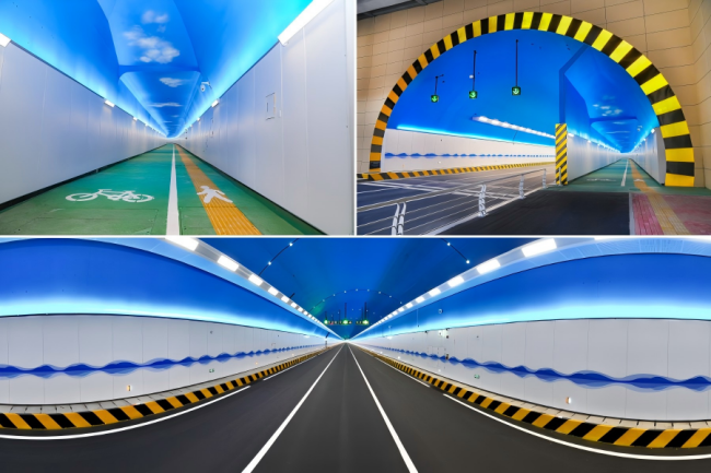 春喧路道路建設(shè)工程全長1620米,其中玉皇山隧道長1150米,單洞斷面寬度19.8米、高度13.6米,快車道11米,行人及非機(jī)動(dòng)車道4米。玉皇山隧道斷面采用左右線分離雙洞形式,每洞設(shè)置中隔墻,將機(jī)動(dòng)車道與人非通道徹底隔離,形成獨(dú)立車行和慢行孔洞,確保行人通行安全。隧道南口設(shè)置聲屏障,有效降低行車噪音對(duì)周邊居民小區(qū)、學(xué)校的影響。隧道北洞口采用彩繪施工工藝,與周圍環(huán)境融為一體,整體意境深遠(yuǎn),形成虛實(shí)對(duì)比。隧道內(nèi)以“山水泉城”為主題,設(shè)置泉城特色星空頂、藍(lán)天白云噴繪,極大提升整體觀感和行車舒適度。